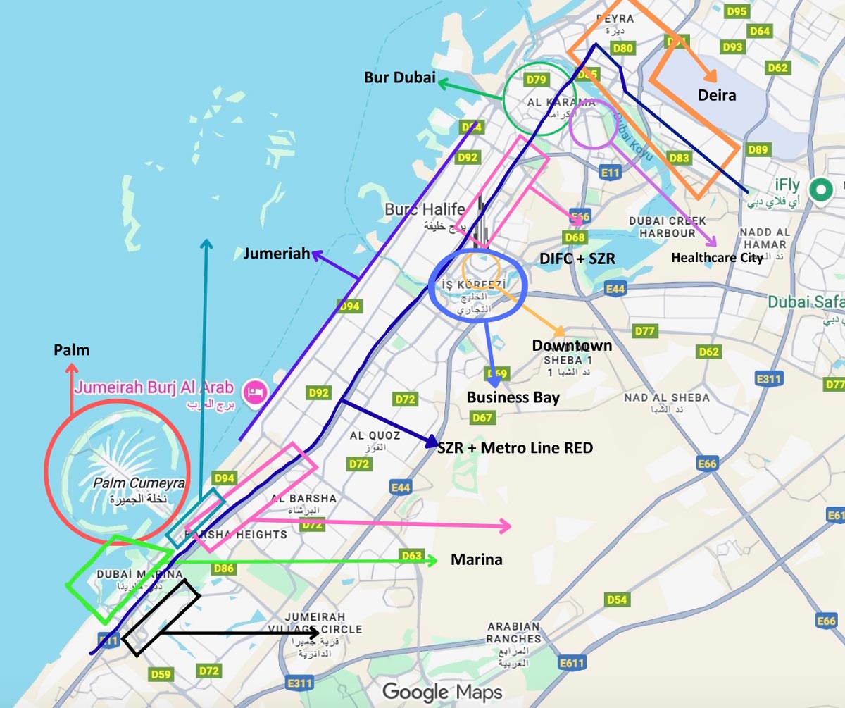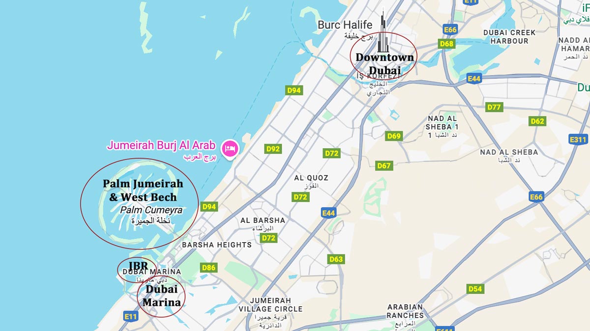 – JBR: Açılımı Jumeirah Beach Residence olan JBR, adının yansıttığı gibi Palm Jumeirah’nın dibinde, kendine ait plajıyla deniz kenarında bulunan popüler bir yaşam bölgesi. Plaj şeridi boyunca uzanan The Walk isimli yürüyüş yolu, otel çeşitliliği ve restoran, mağaza gibi olanakların zenginliğiyle Dubai’ye ilk kez gelenler, çocuklu aileler ve denize yakın olmak isteyenler için ideal. Konaklama tipleri daha çok lüks oteller, rezidanslar ve dairelerden oluşuyor. Metro artı tramvay yaparak şehrin çoğu noktasına ulaşmak mümkün fakat tabii ki Downtown Dubai kadar da merkezi bir bölge değil.