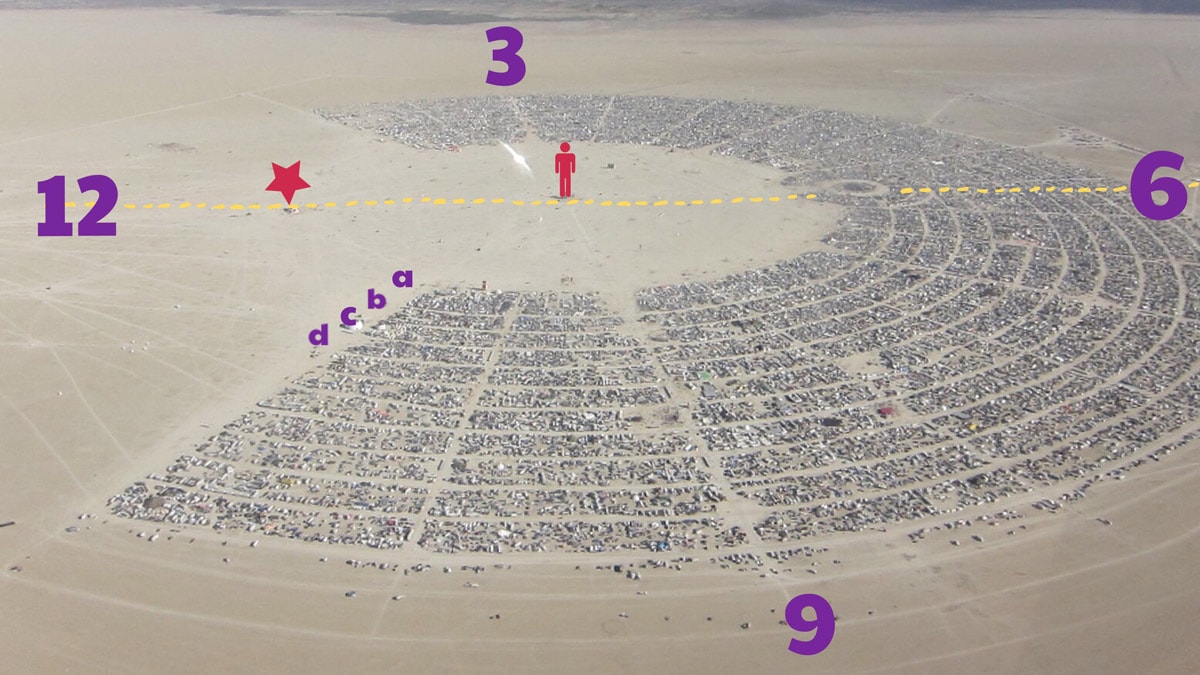 How do you find your camp, friends, events in a temporary city with a population of 80,000 set up in the middle of the desert? Burning Man has its own address system. For instance, our camp’s address 8.45 & C.