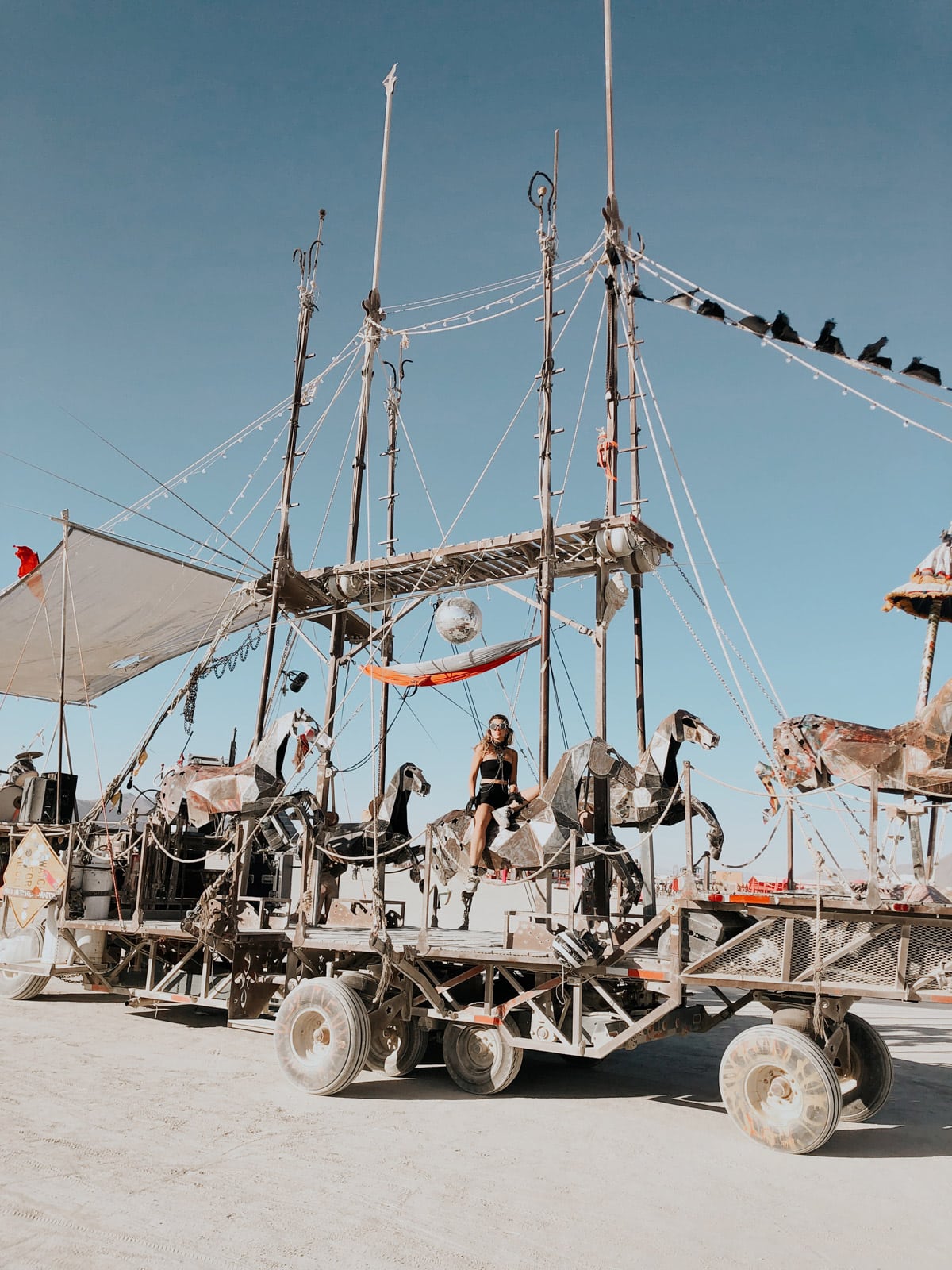 Because our friend who invited us to Burning Man has been coming here with the same crew for several years, so we were able to join their camp. This provided us with a shared kitchen and a lounge, a shared meal we cooked together every evening, a bar where we served pickle juice and whiskey as a gift to the community, and a facial mask party but our camp didn’t have an art car.