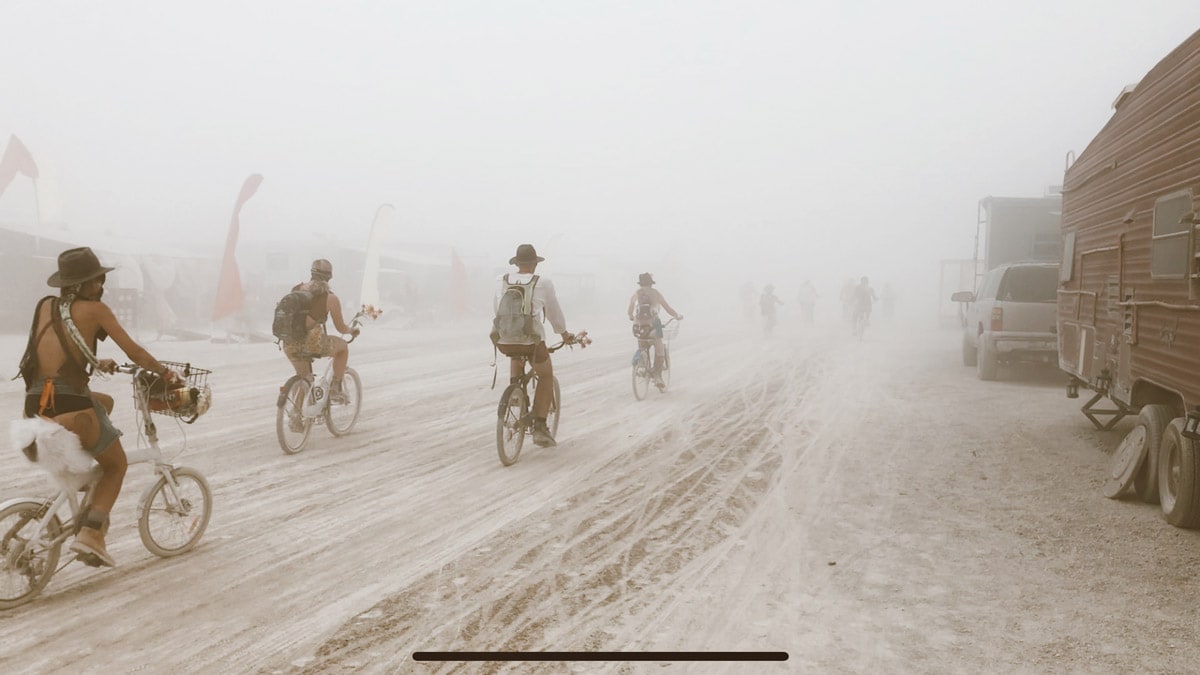 The dust is unavoidable. Sometimes the storms get so bad that you can’t see beyond your nose. You should bring a pair of goggles and a scarf to wrap around your face. The playa dust contains hazardous, cancerogenic substances. When storms break out, it’s a good idea to wear a carbon filter mask. We bought ours on Amazon. I’d say pack two per person.