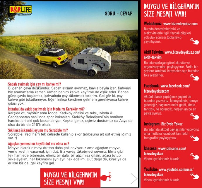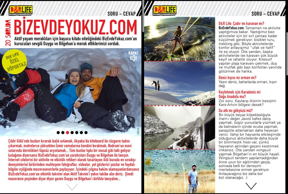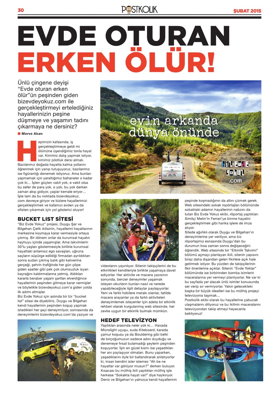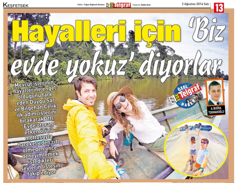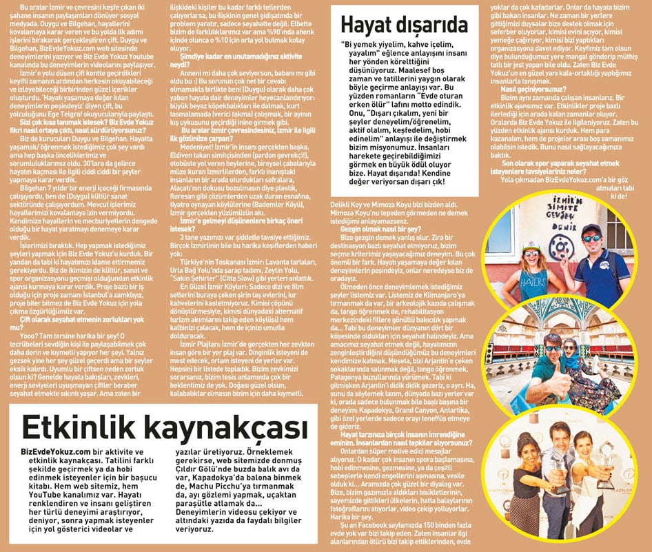 Biz Duygu & Bilgehan. 2014’te hayatımızı baştan çizmeye karar verdik. Daha dolu, daha aktif bir hayat kurmanın peşine düştük. Adını da Biz Evde Yokuz koyduk. Sitemiz aktivite, macera ve gezi rehberi. Tatiller ve seyahatler için hem Türkiye, hem de yurt dışı önerileriyle bir kaynak. Daha fazla bilgi için: BİZ KİMİZ?