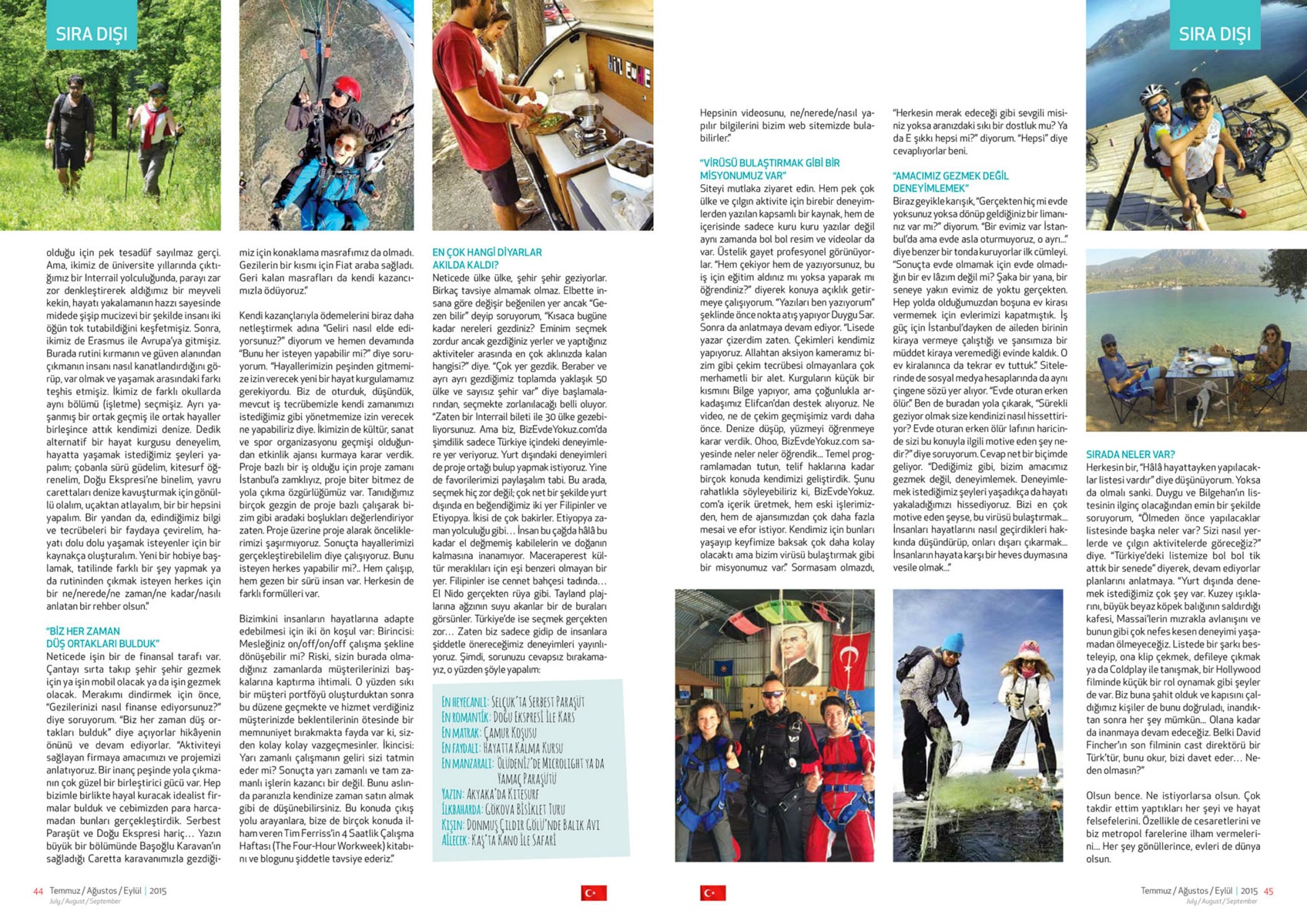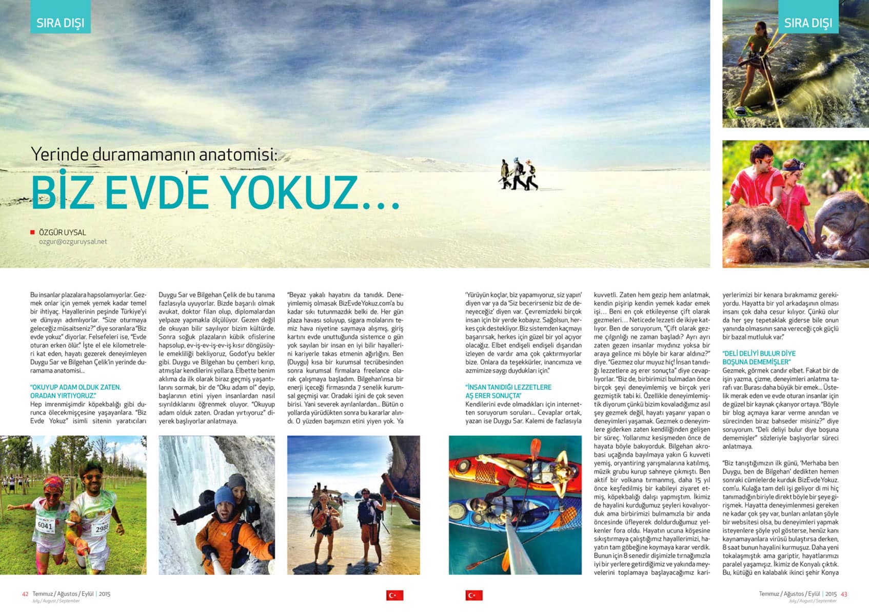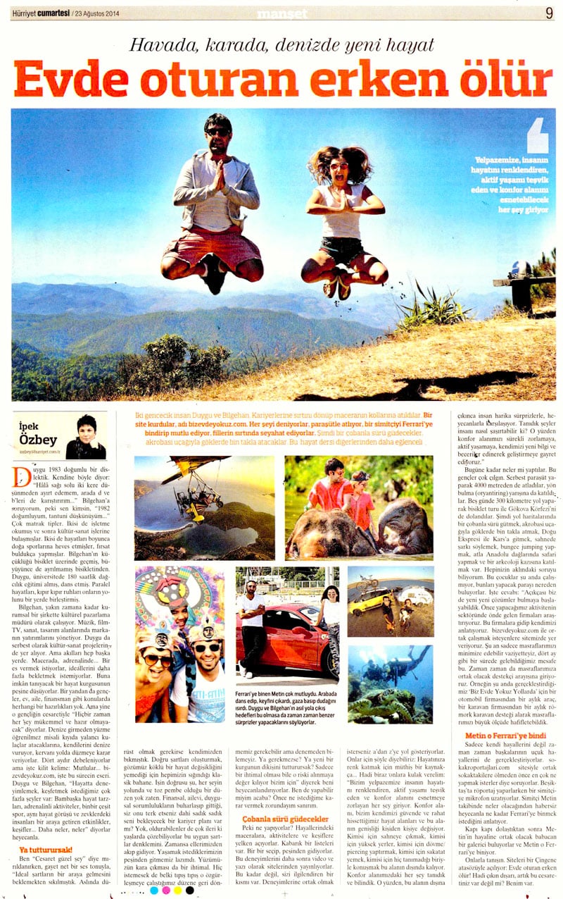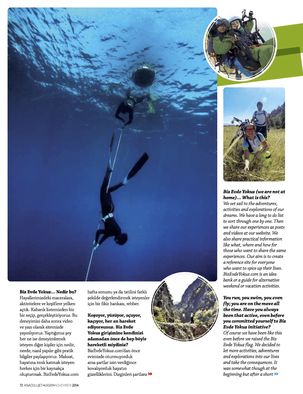 Biz Duygu & Bilgehan. 2014’te hayatımızı baştan çizmeye karar verdik. Daha dolu, daha aktif bir hayat kurmanın peşine düştük. Adını da Biz Evde Yokuz koyduk. Sitemiz aktivite, macera ve gezi rehberi. Tatiller ve seyahatler için hem Türkiye, hem de yurt dışı önerileriyle bir kaynak. Daha fazla bilgi için: BİZ KİMİZ?