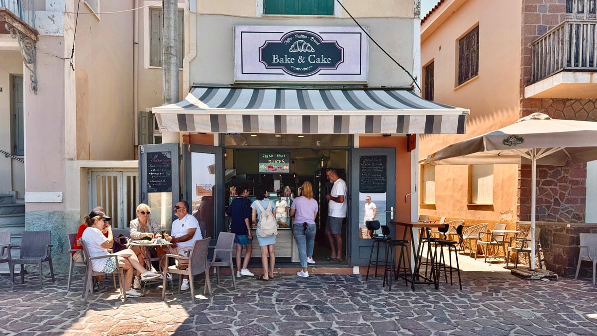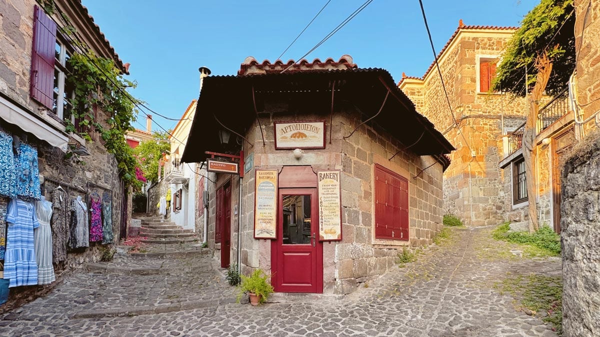 Bakery, Molyvos: Molyvos Kalesi’ne çıkan sokakların birinde, tarihi bir taş binada bulunan yerel fırın. Ekmekten kruvasana, tarçınlı çörekten turtalara çeşit çeşit unlu mamule sahip. Konum için tıklayın. Haritada 37 numara.