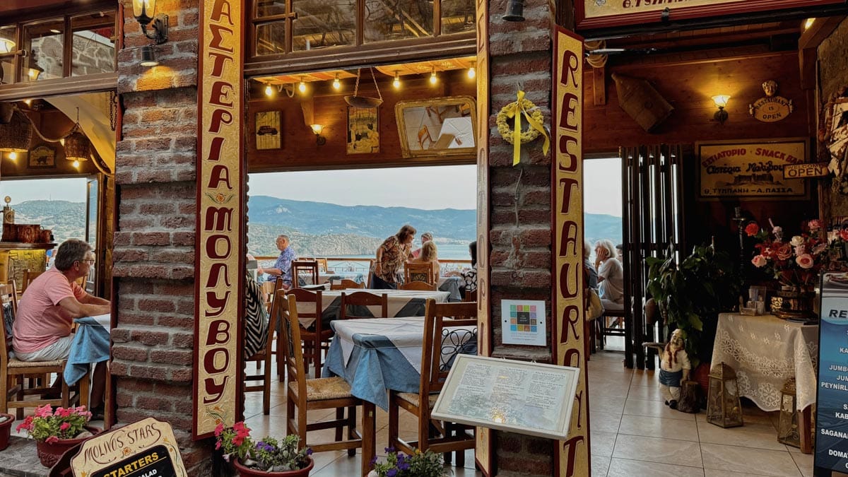 Molyvos Stars Restaurant, Molyvos: Molyvos’un eski şehrinin kaldırımlı sokaklarının birinde yüksekçe bir konumda bulunan, deniz manzaralı bir restoran. Menüsü otantik Yunan yemeklerinden oluşuyor. Özellikle balkon kısmında oturmak istiyorsanız önceden rezervasyon yaptırmak gerekiyor. Konum için tıklayın. Haritada 36 numara.