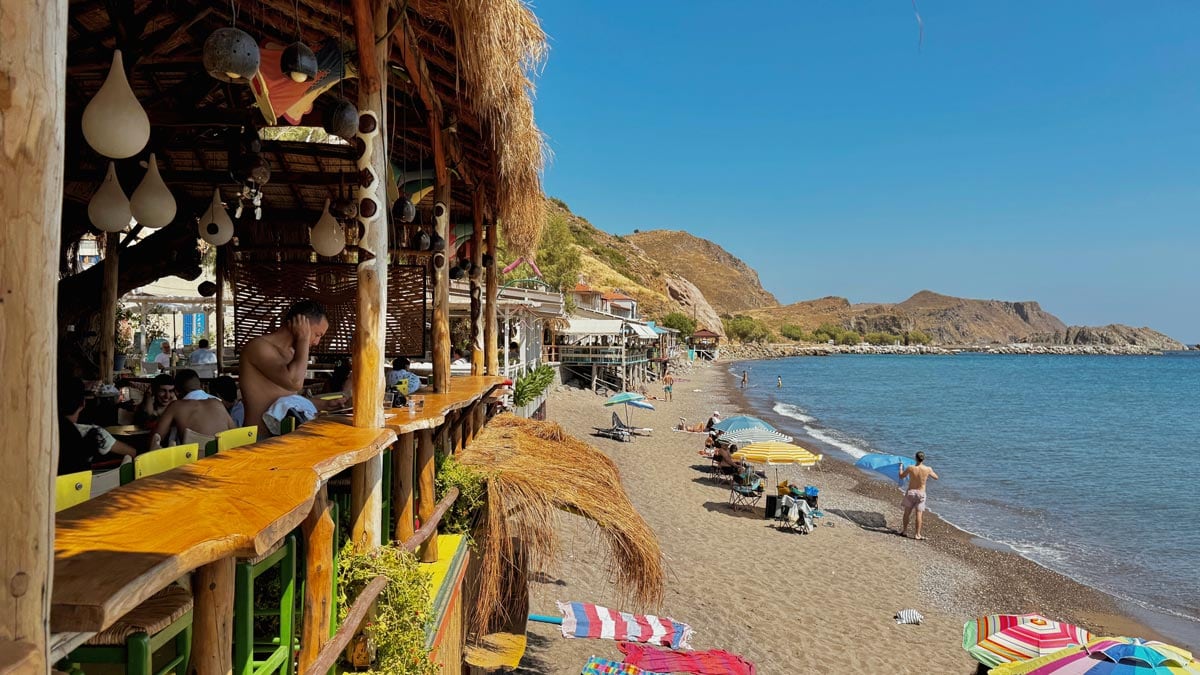 – Midilli, Samos ve Sakız ise aralarında en otantik olan ancak içlerinde Midilli diğerlerine kıyasla daha canlı bir gece hayatına sahip. Sakız ve Samos’ta yemekten sonra geceler dondurmacıda ya da bi kafede noktalanırken, Midilli’de gençlerin köşe barlarda ayak üzeri buluşup bir şeyler içtiği, buzuki eşliğinde Yunan türküleri söylediği bir merkezi var. Gündüzleri ise bolca bakir plaj, salaş ama samimi işletmeler, sakin ada hayatı sizi bekliyor. Elbette diğer adaları için de bunlar sayılabilir ama Midilli’nin büyük yüz ölçüsünden ötürü (Yunanistan’ın en büyük 3. adası) burası için sanki biraz daha geçerli. 🙂 Ne kadar kalabalık olursa olsun, çok büyük bir ada olduğu için kalabalığı hissetmiyorsunuz. Biz bir bayram haftasında gitmiş olmamıza rağmen yer yok diye şezlongda oturamadığımız plaj olmadı. Fakat adanın en popüler mekanlarına rezervasyonsuz gitmemek gerekir.