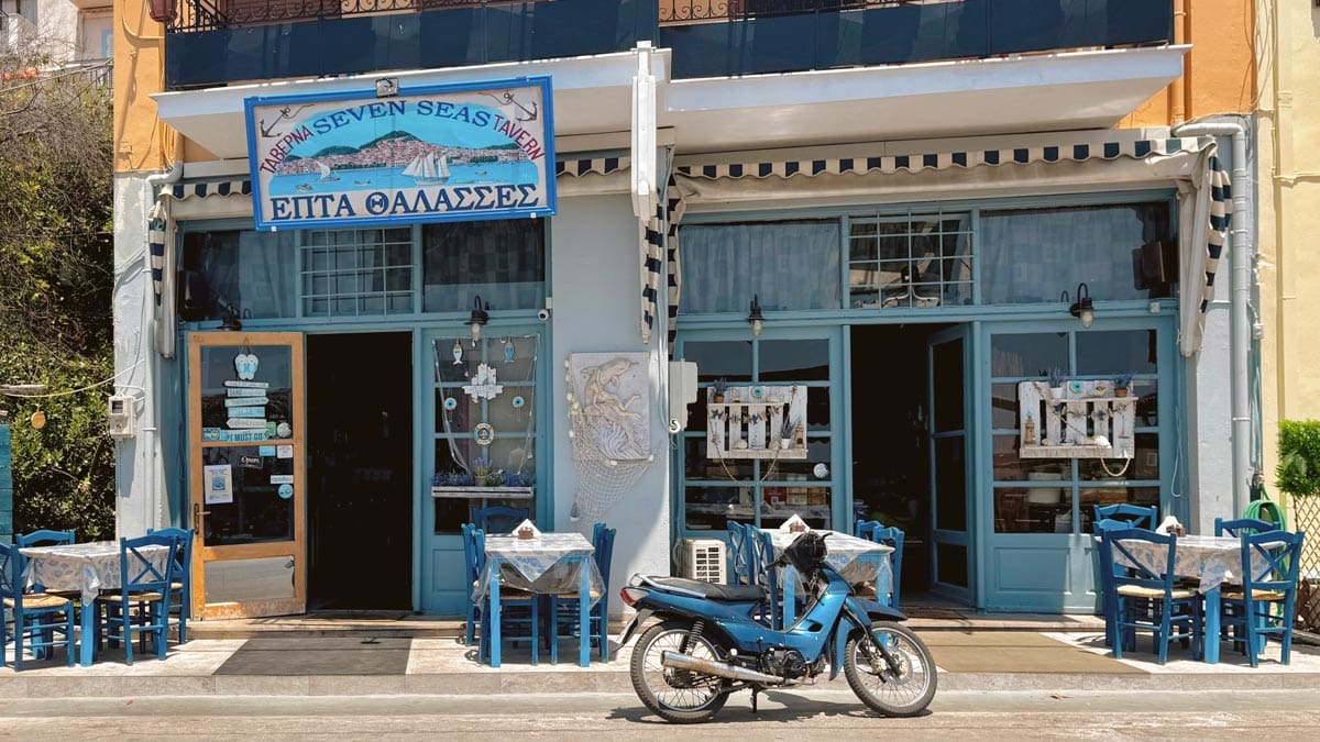 Seven Seas Taverna, Plomari: Plomari sahilinde, iskele manzaralı bir taverna. Mavi sandalyeleri ve önü deniz gören açık balkonuyla tam bir ada restoranı. Menüsü oldukça beğeniliyor ve kabak çiçeğinden patlıcanına her kızartması oldukça iyi. Deniz ürünlerini denemelisiniz ve kalamar yemeden de ayrılmayın. Konum için tıklayın. Haritada 54 numara.