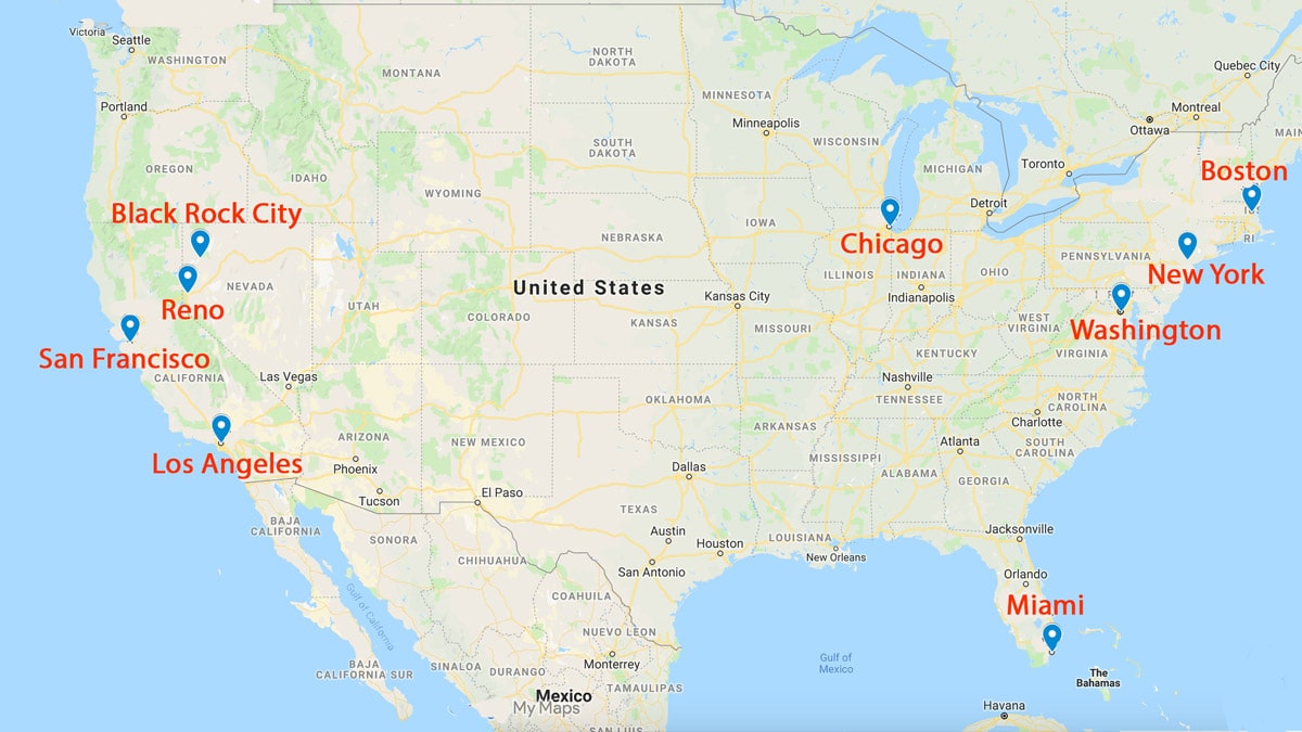 Reno – The closest major city, about a 2-hour drive from BRC. There is an airport here (Reno -Tahoe). There are no international flights, but you can find connecting flights via other U.S. cities.
